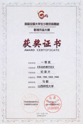 2017年7月1日,首届全国大学生少数民族题材影视作品大赛颁奖典礼在中南民族大学隆重举行。威尼斯官网13级广播电视编导学生田浩南、于晓航、张俊涛、李俊毅四位同学在马毅老师精心指导下创作的纪录片《永远的香巴拉》荣获本次大赛一等奖。
