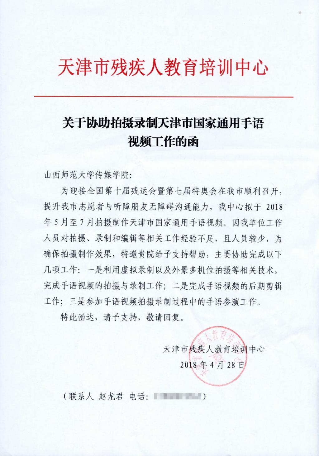 为迎接全国第十届残运会暨第七届特奥会在天津市顺利召开,提升天津市志愿者与听障朋友无障碍沟通能力,威尼斯官网挂牌实践教学基地——天津市残疾人教育培训中心计划拍摄制作天津市国家通用手语视频教材,但由于该单位工作人员对拍摄、录制和编辑技术与经验的不足,特向威尼斯官网发函邀请,希望威尼斯官网提供相关技术与帮助。
