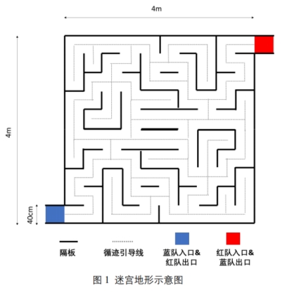 (1) 迷宫:在室内体育馆里搭建,面积约 4m×4m,如图 1 所示。迷宫地面颜色为白色,迷宫白色隔板的厚度和高度由组委会给定。隔板只在与边界平行或垂直的方向放置。隔板之间为迷宫车道,宽约 40cm。沿车道的中线粘贴约 2cm 宽的黑色胶带作为循迹线,小车可综合运用循迹和避障技术自动行驶。迷宫左下角开口处地面涂蓝色,为蓝队小车的迷宫入口,同时也是红队的迷宫出口。迷宫右上角开口地面涂红色,是红队入口,蓝队出口。