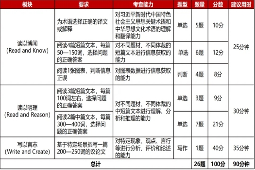 B. 综合能力赛项:进行读写译综合考查,线上初赛赛题包括客观题若干道和议论文写作1篇,具体赛题模块见下表。
