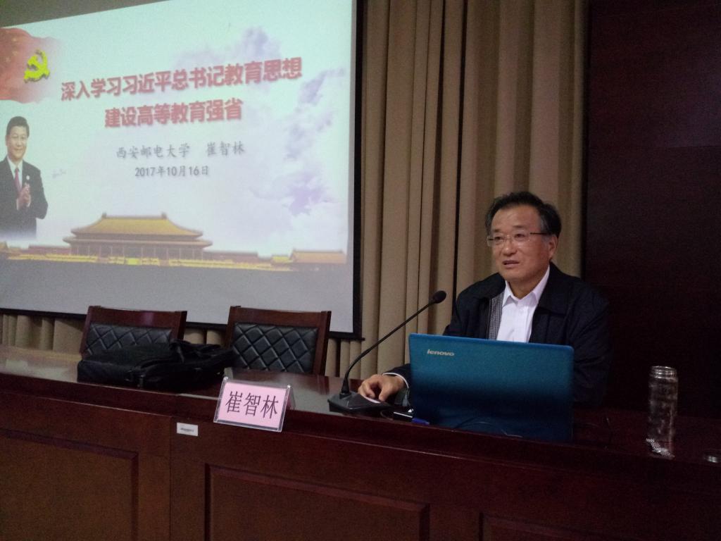 崔智林在报告中指出,党的十八大以来,习近平总书记围绕党在新形势下的治国理政,提出了一系列相互联系、相互贯通的新理念新思想新战略,形成了一个系统完整、逻辑严密的科学理论体系。习近平治国理政思想是中国特色社会主义理论体系的最新成果,是马克思主义在当代中国的最新发展,具有重大的政治意义、理论意义、实践意义和方法论意义。以习近平同志为核心的党中央高瞻远瞩,纵览全局,紧紧围绕实现“两个一百年”奋斗目标和实现中华民族伟大复兴中国梦,积极推进教育理论和实践创新,提出了一系列富有中国特色、体现时代精神、引领创新发展的新理念新思想新战略,指明了我国教育改革发展的目标和方向,揭示了中国特色社会主义教育的本质和发展规律,形成并确立了习近平总书记的现代教育思想体系。深入学习和研究习近平总书记关于教育思想,对于建设中国特色的现代教育理论体系,指导我国教育事业的改革发展,具有重要的理论意义和实践意义,为新时期推进中国高等教育改革发展提供了科学理论指导和行动指南。