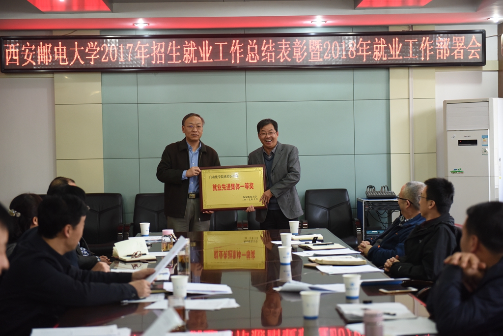 会上,招生宣传先进集体代表自动化学院党委书记刘国营和就业工作先进集体代表计算机学院党委书记彭程分别做了交流发言。招生就业处处长樊继福总结了2017年招生和就业工作,招生就业处副处长赵补生安排了2018年就业工作。