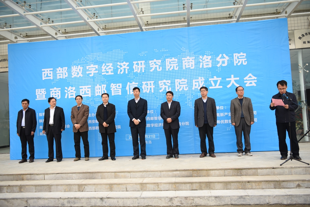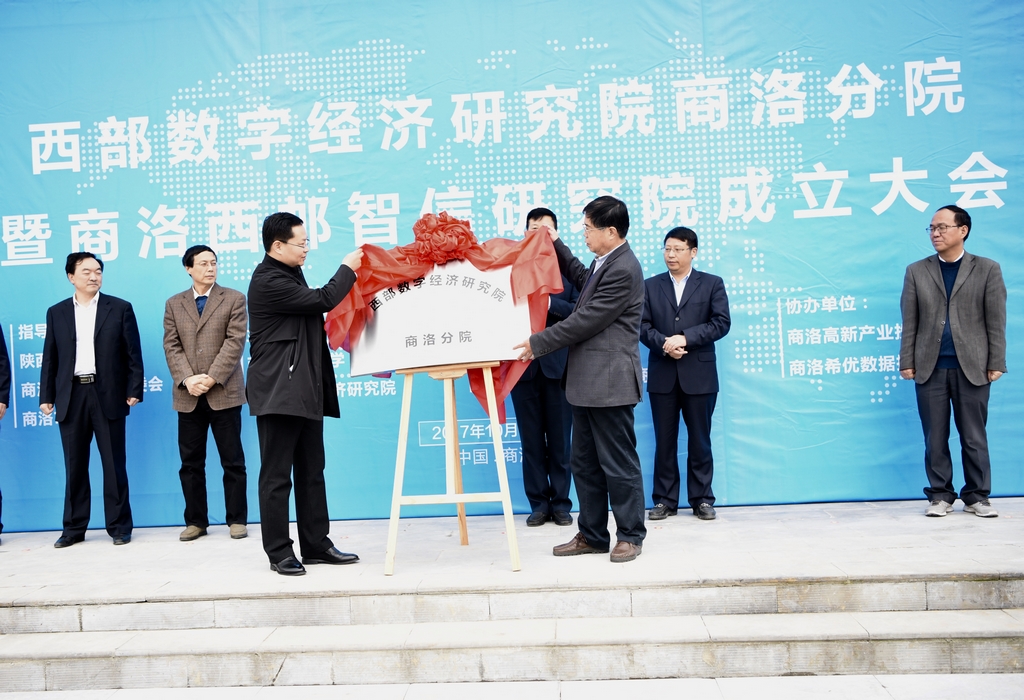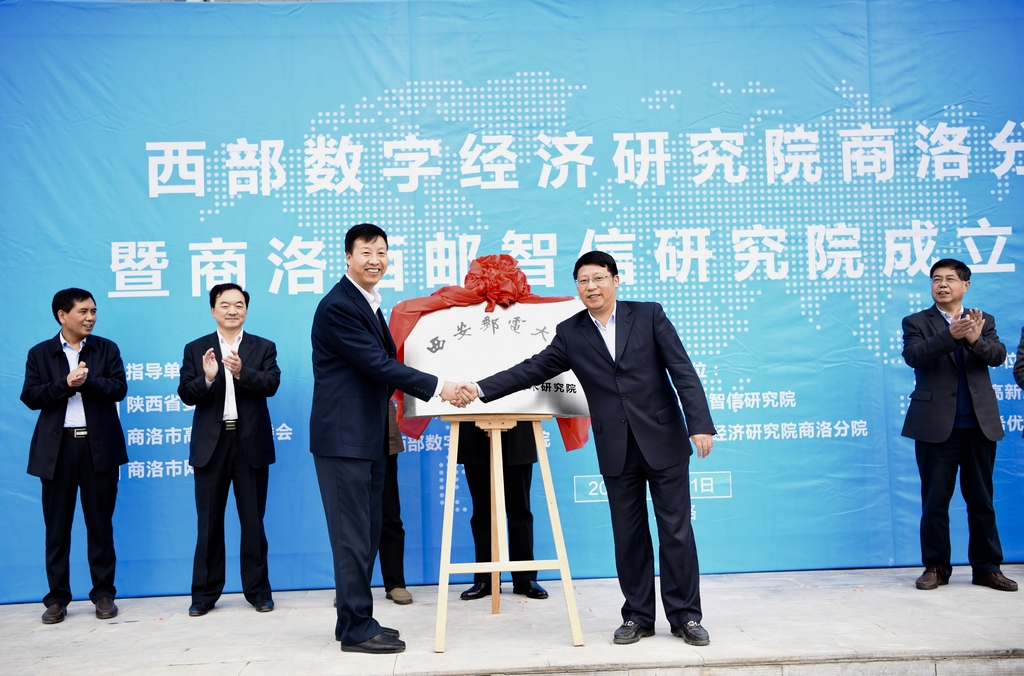 本网讯 10月31日下午,西部数字经济研究院商洛分院暨西邮智信研究院在商洛高新区正式成立。商洛市委秘书长周和斌、陕西省网信办网络经济处副处长陈鹏飞、Beat365副校长安增旺、数字经济研究院院长张鸿共同为“两院”揭牌。