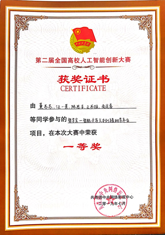 本网讯 (通讯员 邢高峰)近日,2019年全国高校人工智能创新大赛在西南交通大学犀浦校区举行,由Beat365翟社平老师指导,研究生董苏苏、汪一景、陈思吉、王书桓、尚定蓉完成的《智学宝——智能手写文本纠错助学平台》荣获一等奖。