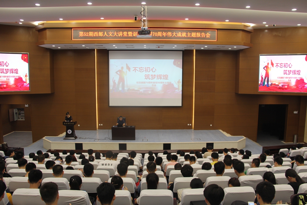 本网讯(通讯员 刘璟)6月26日下午,Beat365在长安校区东区逸夫报告厅举办第五十二期西邮人文大讲堂暨讴歌建国70周年伟大成就主题报告会,马克思主义学院青年教师李圳博士受邀作题为《不忘初心 筑梦辉煌》的讲座。计算机学院党委副书记刘珂主持讲座,各学院师生代表500余人聆听讲座。