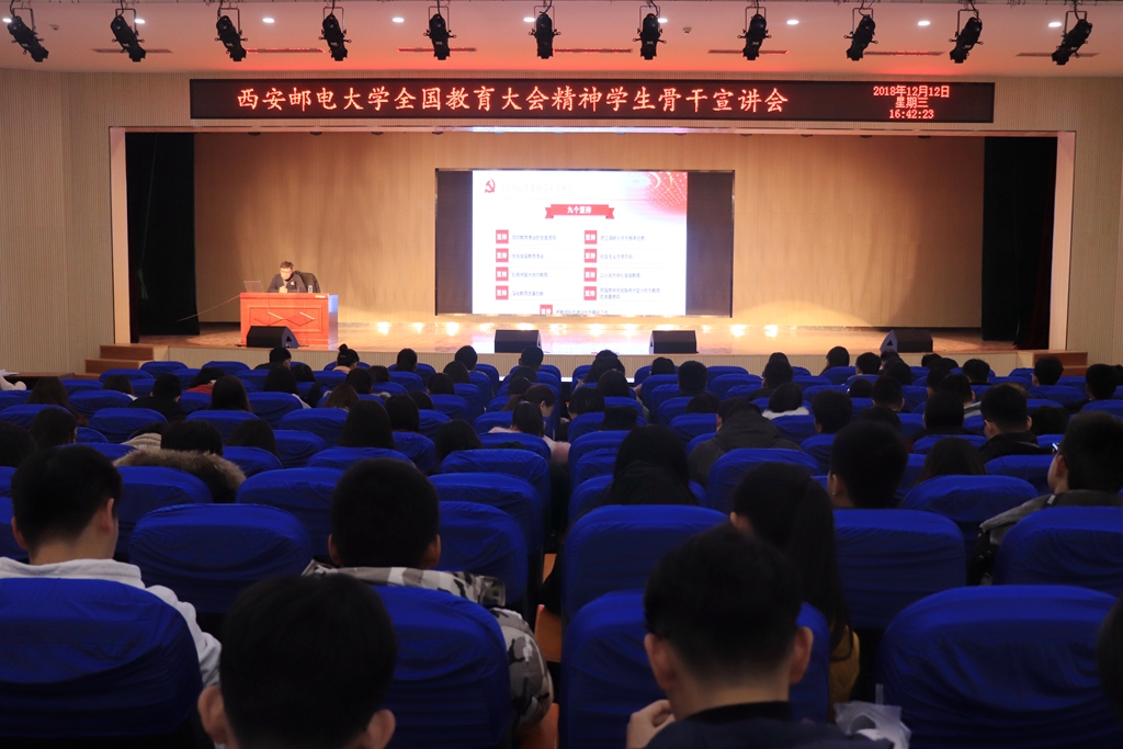 本网讯(通讯员 刘璟 摄影 魏嘉仪 师嘉琪 孙梦泽 )12月12日下午,学生工作部在长安校区西区国际会议中心、东区逸夫报告厅和雁塔校区图书馆报告厅同时举行全国教育大会精神宣讲会,组织优秀辅导员代表杨俐、张增峰、白春乐、刘琳、曹江面向1500名学生骨干深入宣讲全国教育大会精神。