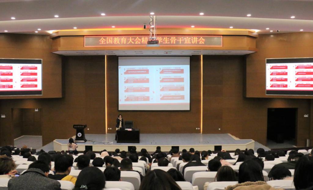 宣讲会上,杨俐老师从“为什么、是什么、怎么做”三个方面,深入浅出的解读了全国教育大会精神,并勉励青年学生应该具备“大”抱负与“大”担当、“大”气魄与“大”情怀、“大”智慧与“大”视野,这样才能大有作为,不辜负这个大时代;张增峰老师系统讲解了全国教育大会召开的背景和主要内容,重点讲述了全国教育大会精神对促进当代大学生的个人成长发展的作用和意义;白春乐老师以《勇担时代重任、牢记青春使命》为题,号召学生骨干坚定理想信念,不忘初心,砥砺前行,争做“爱国、励志、求真、力行”的新时代青年。刘琳老师讲解了全国教育大会的“九个坚持”、“六个下功夫”、“一个目标”、“一个根本任务”,并结合学生工作的实际情况,对学生骨干如何发挥示范引领作用进行了重点阐述。曹江老师希望学生骨干发挥示范带头作用,在学深悟透上下功夫,在入脑入心上下功夫,在学用结合上下功夫,将大会精神转化为实际奋斗动力。