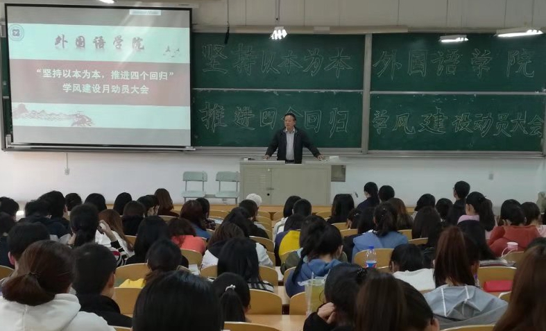 本网讯 为响应学校“坚持以本为本,推进四个回归”学风建设月活动号召,调动学生学习积极性,营造良好学习氛围,10月10日中午,外国语学院在B114教室召开学风建设动员大会。外国语学院院长袁小陆,副院长张利,教务办、学工办负责人,各专业负责人,辅导员老师以及全院学生参加会议。外国语学院党总支书记黄小梅主持会议。