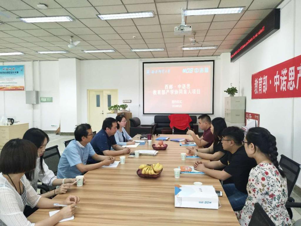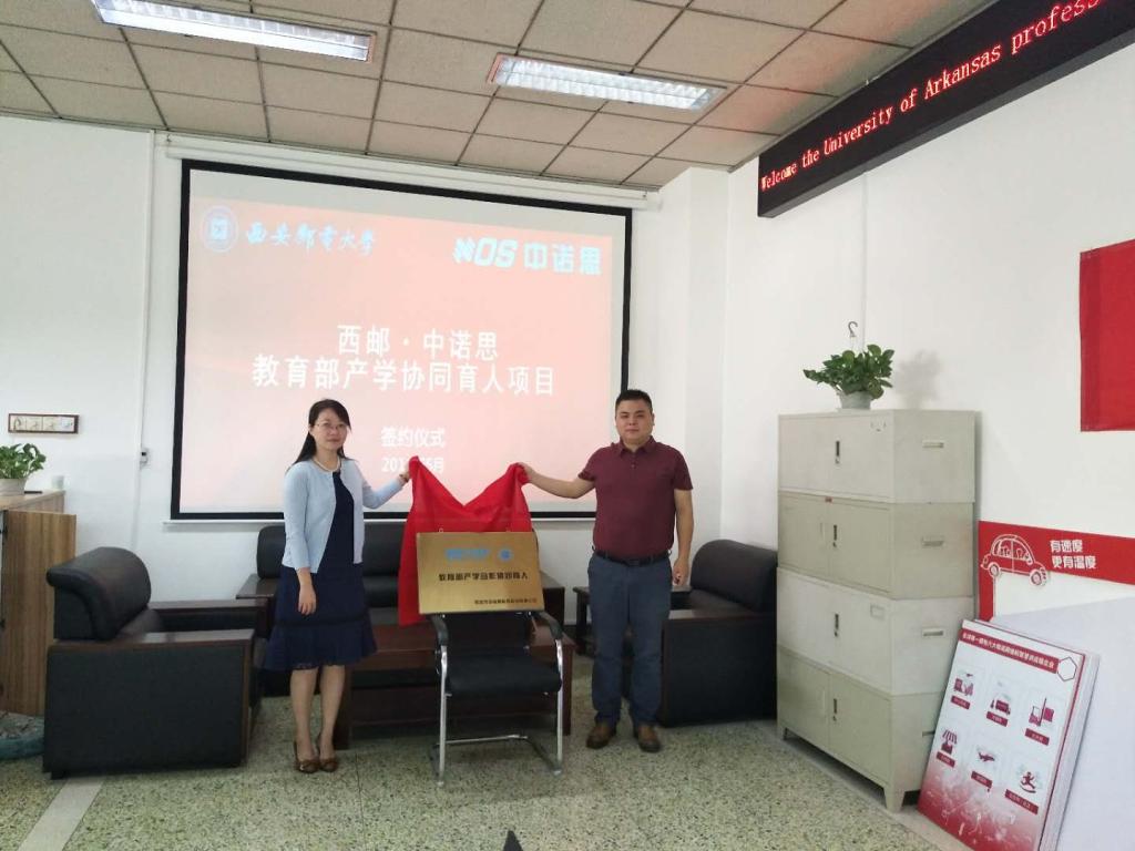 本网讯 5月31日上午,现代邮政学院在雁塔校区现代邮政协同创新中心举行教育部产学协同育人项目签约揭牌仪式。深圳中诺斯科技股份有限公司西安分公司总经理胡文龙,现代邮政学院副院长谢逢洁、工业工程系主任李永飞及师生代表参加揭牌仪式,仪式由物流管理系教师周海明主持。