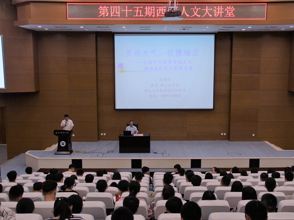 本网讯 5月17日下午,第四十五期西邮人文大讲堂在东区逸夫楼报告厅精彩开讲。西北大学慈善研究院院长陈国庆教授作题为《灵动大气,优雅端庄——弘扬中华优秀传统文化》的主题报告,500余名学生聆听报告,学生工作部副部长姜毅龙主持报告会。