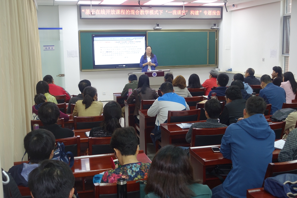 本网讯 4月12日,教师发展中心、教务处联合举办了第三期“信息化条件下教学模式改革”专题系列报告,邀请陕西省教学名师王曙燕教授作“基于在线开放课程的混合教学模式下‘一流课堂’构建”专题报告。学校近两年参与课程建设、教学模式改革项目成员教师80余人参加报告会。