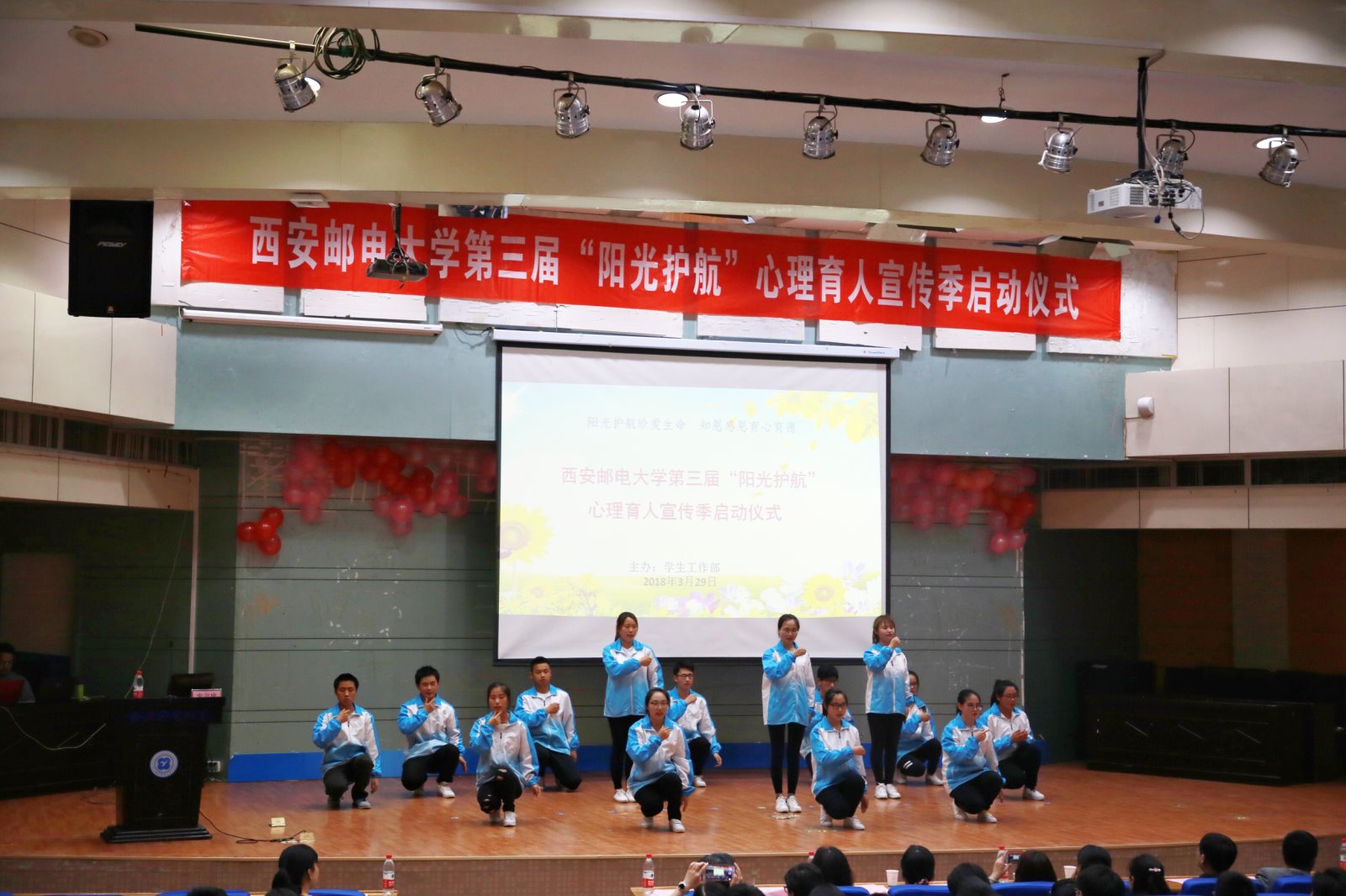 本网讯 3月29日,Beat365中文官方网站第三届“阳光护航”心理育人宣传季活动在长安校区启动。党委宣传部、学生工作部、校团委负责人和各学院书记或副书记,全体辅导员,学工部全体工作人员及学生代表400余人参加了启动仪式。学工部副部长姜毅龙主持会议。