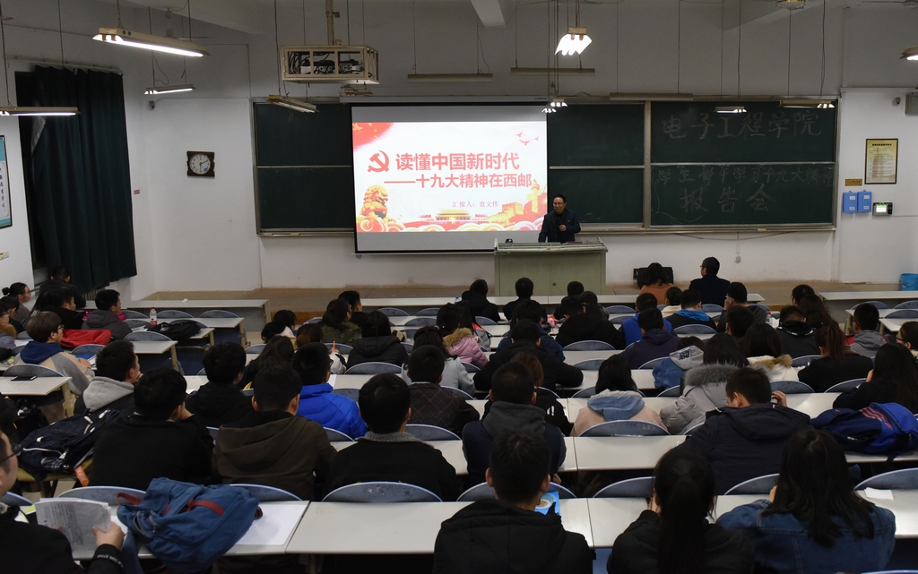 本网讯 为深入学习宣传贯彻党的十九大精神,用习近平新时代中国特色社会主义思想武装学生头脑,进一步坚定大学生理想信念,充分发挥学生党员干部的先锋模范作用,11月30日下午,电子工程学院在长安校区西区教学楼B214教室举办党的十九大精神宣讲报告会,邀请学校党的十九大精神宣讲团成员、马克思主义学院副院长袁文伟博士作题为《读懂中国新时代——十九大精神在西邮》宣讲报告,党委宣传部副部长师妍参加报告会,电子工程学院学生党员、入党积极分子、学生干部代表200余人参加,报告会由电子工程学院党委书记马斌奇主持。