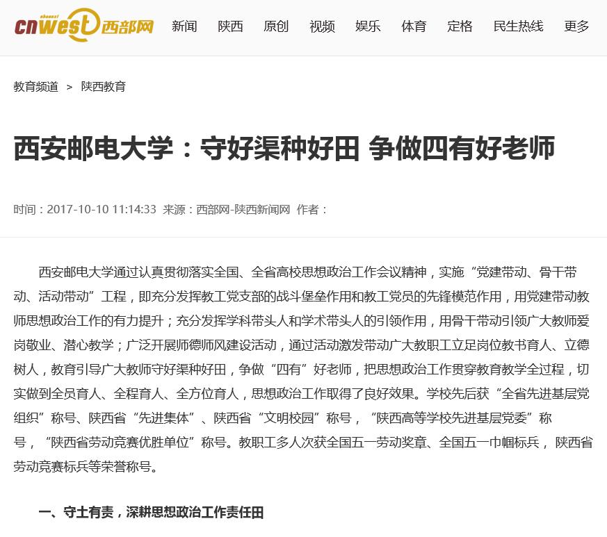 Beat365中文官方网站通过认真贯彻落实全国、全省高校思想政治工作会议精神,实施“党建带动、骨干带动、活动带动”工程,即充分发挥教工党支部的战斗堡垒作用和教工党员的先锋模范作用,用党建带动教师思想政治工作的有力提升;充分发挥学科带头人和学术带头人的引领作用,用骨干带动引领广大教师爱岗敬业、潜心教学;广泛开展师德师风建设活动,通过活动激发带动广大教职工立足岗位教书育人、立德树人,教育引导广大教师守好渠种好田,争做“四有”好老师,把思想政治工作贯穿教育教学全过程,切实做到全员育人、全程育人、全方位育人,思想政治工作取得了良好效果。学校先后获“全省先进基层党组织”称号、陕西省“先进集体”、陕西省“文明校园”称号,“陕西高等学校先进基层党委”称号,“陕西省劳动竞赛优胜单位”称号。教职工多人次获全国五一劳动奖章、全国五一巾帼标兵, 陕西省劳动竞赛标兵等荣誉称号。