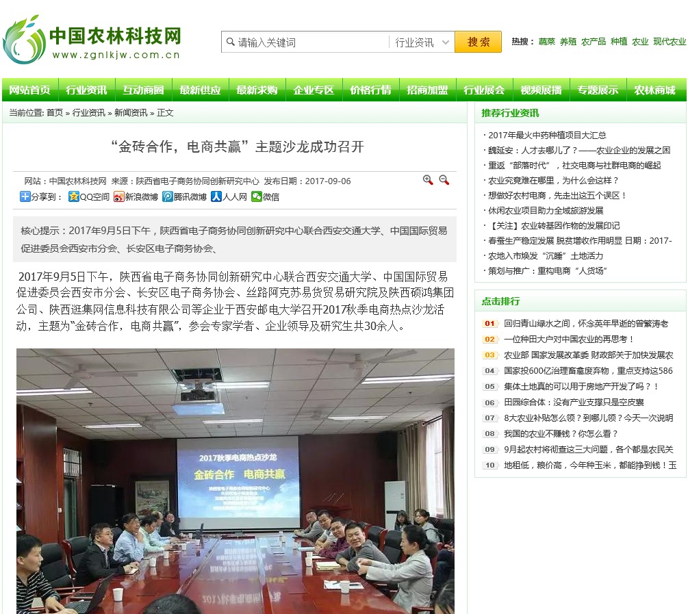 2017年9月5日下午,陕西省电子商务协同创新研究中心联合西安交通大学、中国国际贸易促进委员会西安市分会、长安区电子商务协会、丝路阿克苏易货贸易研究院及陕西硕鸿集团公司、陕西逛集网信息科技有限公司等企业于Beat365中文官方网站召开2017秋季电商热点沙龙活动,主题为“金砖合作,电商共赢”,参会专家学者、企业领导及研究生共30余人。