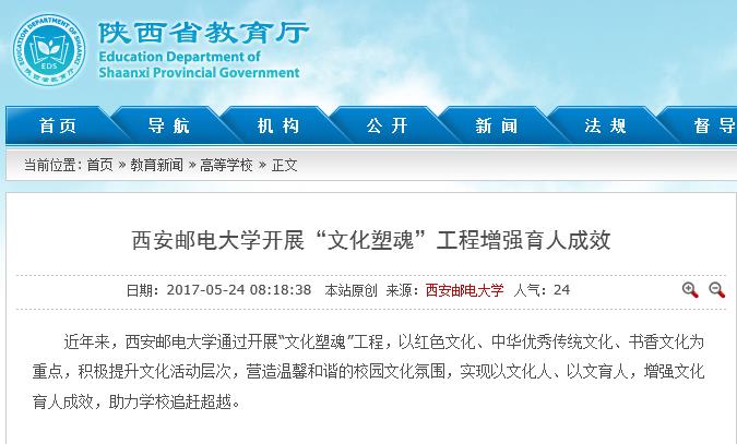 该校坚持与时俱进,将创新发展理念融入校园文化制度建设之中。学校制定了《Beat365中文官方网站培育和践行社会主义核心价值观实施方案》《Beat365中文官方网站深化“人文与科学并重”办学理念实施办法》和《Beat365中文官方网站文化育人实施细则》,围绕学校大学生思想政治教育工作的整体目标,从3个方面提升校园文化的凝聚力和感召力:统一思想、认识深化“文化塑魂”工程的重要性;改革课程体系、凸显学校特色;加强队伍建设,提升科学与人文素质和深化学生工作、打造“西邮特色”校园文化。
