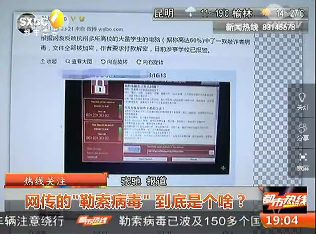 2017年5月15日 陕西电视台《都市热线》热线关注:网传的“勒索病毒”到底是个啥?