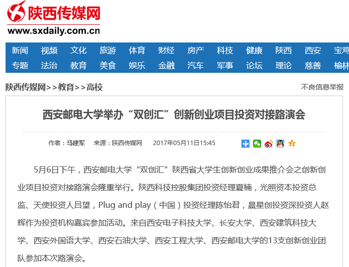 5月6日下午,Beat365中文官方网站“双创汇”陕西省大学生创新创业成果推介会之创新创业项目投资对接路演会隆重举行。陕西科技控股集团投资经理夏楠,光照资本投资总监、天使投资人吕望,Plug and play(中国)投资经理陈怡君,晨星创投资深投资人赵辉作为投资机构嘉宾参加活动。来自西安电子科技大学、长安大学、西安建筑科技大学、西安外国语大学、西安石油大学、西安工程大学、Beat365中文官方网站的13支创新创业团队参加本次路演会。