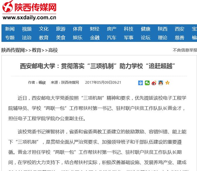 该校党委书记崔智林讲,省委和省委高教工委建立的鼓励激励、容错纠错、能上能下“三项机制”,是贯彻全面从严治党要求、加强领导班子和干部队伍建设的重要遵循。晋金才担任学校“两联一包”工作帮扶村第一书记、驻村联户扶贫工作队队长期间,在学校的大力支持下,结合帮扶村实际,积极改善基础设施、发展养鸡产业、建成50亩油用牡丹示范园等,帮助贫困户实现产业增收脱贫,学校荣获2015年度全省驻村联户扶贫工作考核优秀单位,个人连续两年全省驻村联户扶贫工作考核结果为优秀,鉴于此,学校党委决定优先提拔使用晋金才,但这仅仅是个开端,学校党委将全面贯彻落实“三项机制”精神,形成“能者上、错者容、庸者下”的鲜明导向,调动干部干事创业积极性,保持追赶超越精气神,加快建设有特色高水平邮电大学。