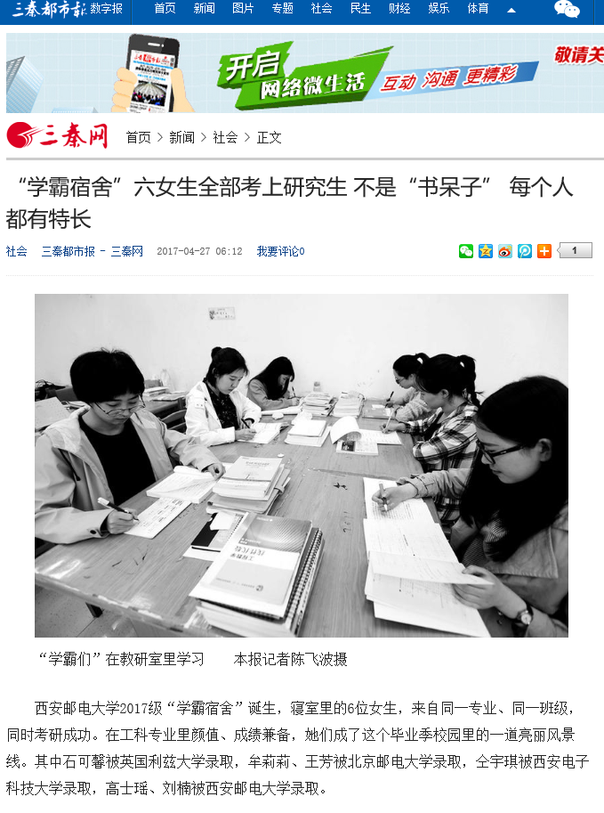 Beat365中文官方网站2017级“学霸宿舍”诞生,寝室里的6位女生,来自同一专业、同一班级,同时考研成功。在工科专业里颜值、成绩兼备,她们成了这个毕业季校园里的一道亮丽风景线。其中石可馨被英国利兹大学录取,牟莉莉、王芳被北京邮电大学录取,仝宇琪被西安电子科技大学录取,高士瑶、刘楠被Beat365中文官方网站录取。