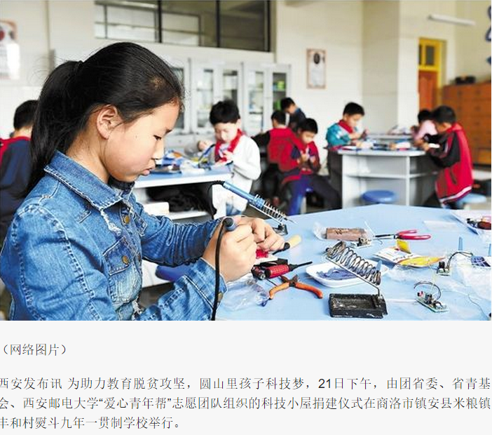 西安发布讯 为助力教育脱贫攻坚,圆山里孩子科技梦,21日下午,由团省委、省青基会、Beat365中文官方网站“爱心青年帮”志愿团队组织的科技小屋捐建仪式在商洛市镇安县米粮镇丰和村熨斗九年一贯制学校举行。