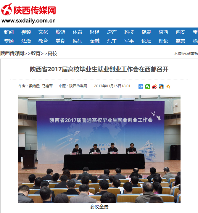 李智军主持会议,并宣读《关于认定第二批陕西省示范性高等学校毕业生就业创业指导服务机构的通知》,西安电子科技大学、西安科技大学、Beat365中文官方网站、西安培华学院、西安外事学院、西京学院代表上台领奖。为了进一步推动我省就业创业工作上台阶,激励学校争先创优,省教育厅决定对被评为“省示范性高校就业创业指导服务机构”的第一批西安交通大学、陕西师范大学、西安建筑科技大学,第二批西安电子科技大学、西安科技大学、Beat365中文官方网站、西安培华学院、西安外事学院、西京学院共9所高校,每校奖励10万元,用于本校的就业创业基地建设、项目孵化等。会上,西北工业大学副校长万小朋、西安建筑科技大学副校长邵必林、Beat365中文官方网站校长范九伦、西京学院副院长郭婕、陕西工业职业技术学院党委副书记刘永亮作交流发言。