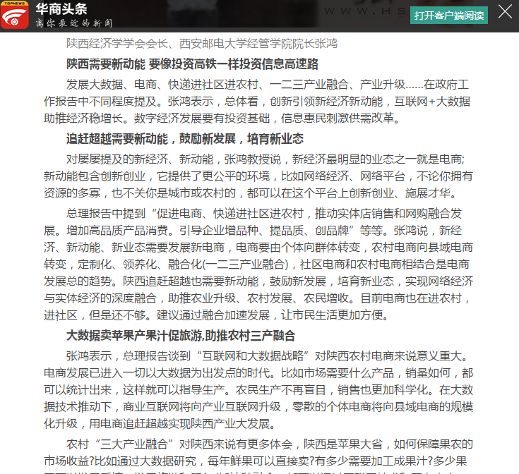 张鸿表示,总理报告谈到“互联网和大数据战略”对陕西农村电商来说意义重大。电商发展已进入一切以大数据为出发点的时代。比如市场需要什么产品,销量如何,都可以统计出来,这样就可以指导生产。农民生产不再盲目,销售也更加科学化。在大数据技术推动下,商业互联网将向产业互联网升级,零散的个体电商将向县域电商的规模化升级,用电商追赶超越实现陕西产业大发展。