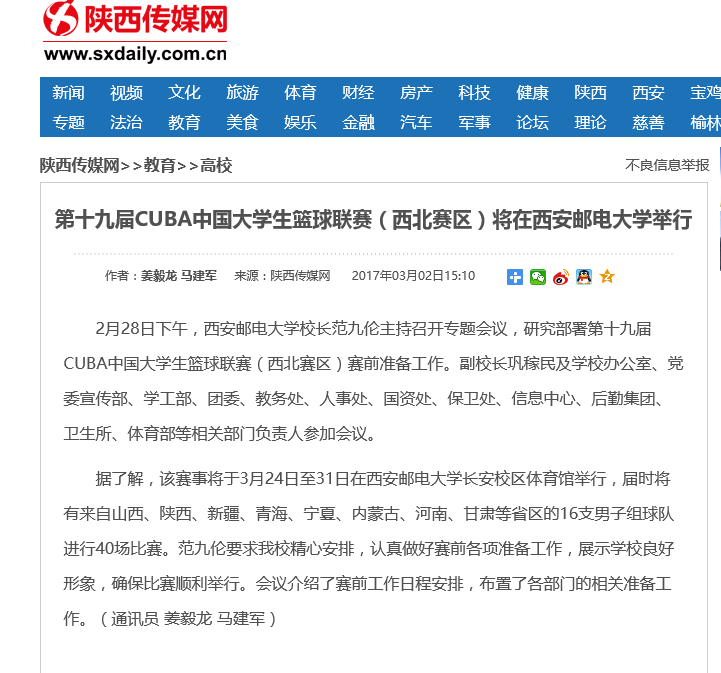 第十九届CUBA中国大学生篮球联赛(西北赛区)将在Beat365中文官方网站举行