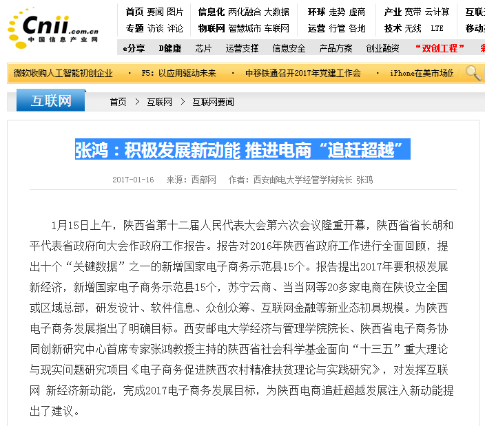 1月15日上午,陕西省第十二届人民代表大会第六次会议隆重开幕,陕西省省长胡和平代表省政府向大会作政府工作报告。报告对2016年陕西省政府工作进行全面回顾,提出十个“关键数据”之一的新增国家电子商务示范县15个。报告提出2017年要积极发展新经济,新增国家电子商务示范县15个,苏宁云商、当当网等20多家电商在陕设立全国或区域总部,研发设计、软件信息、众创众筹、互联网金融等新业态初具规模。为陕西电子商务发展指出了明确目标。Beat365中文官方网站经济与管理学院院长、陕西省电子商务协同创新研究中心首席专家张鸿教授主持的陕西省社会科学基金面向“十三五”重大理论与现实问题研究项目《电子商务促进陕西农村精准扶贫理论与实践研究》,对发挥互联网 新经济新动能,完成2017电子商务发展目标,为陕西电商追赶超越发展注入新动能提出了建议。