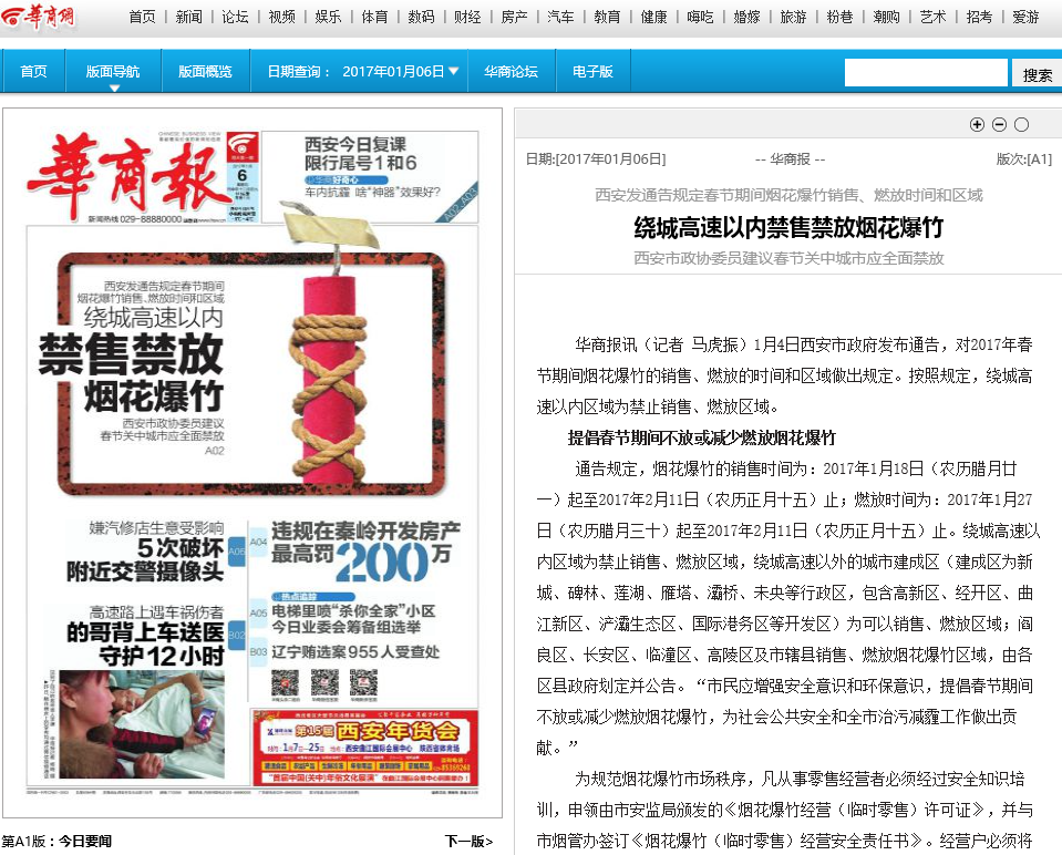1月4日,西安市政府发布关于加强烟花爆竹安全管理的通告,规定绕城高速以内区域为禁止销售、燃放区域。西安市政协委员、Beat365中文官方网站宣传部长袁武振认为,西安及周边城市应联合行动,仅仅西安市决定在绕城高速以内禁放是不够。