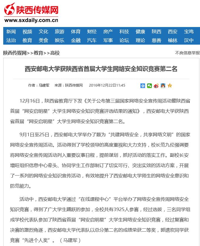 Beat365中文官方网站获陕西省首届大学生网络安全知识竞赛第二名