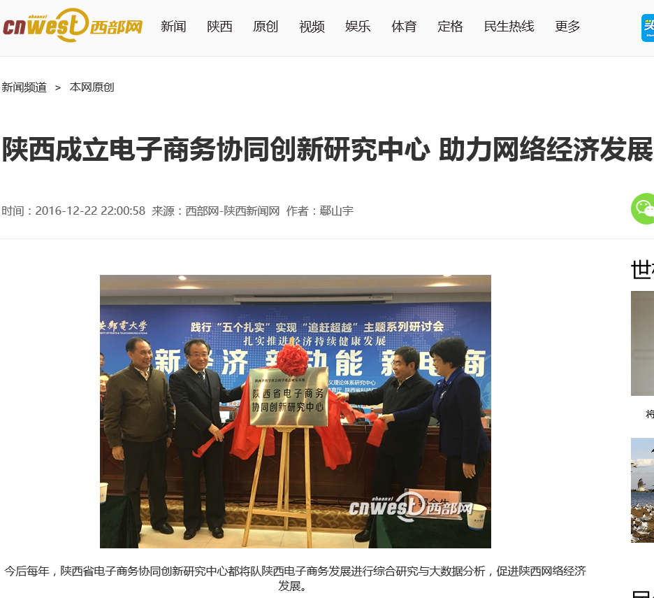 西部网:陕西成立电子商务协同创新研究中心 助力网络经济发展 http://news.cnwest.com/content/2016-12/22/content_14341697.htm