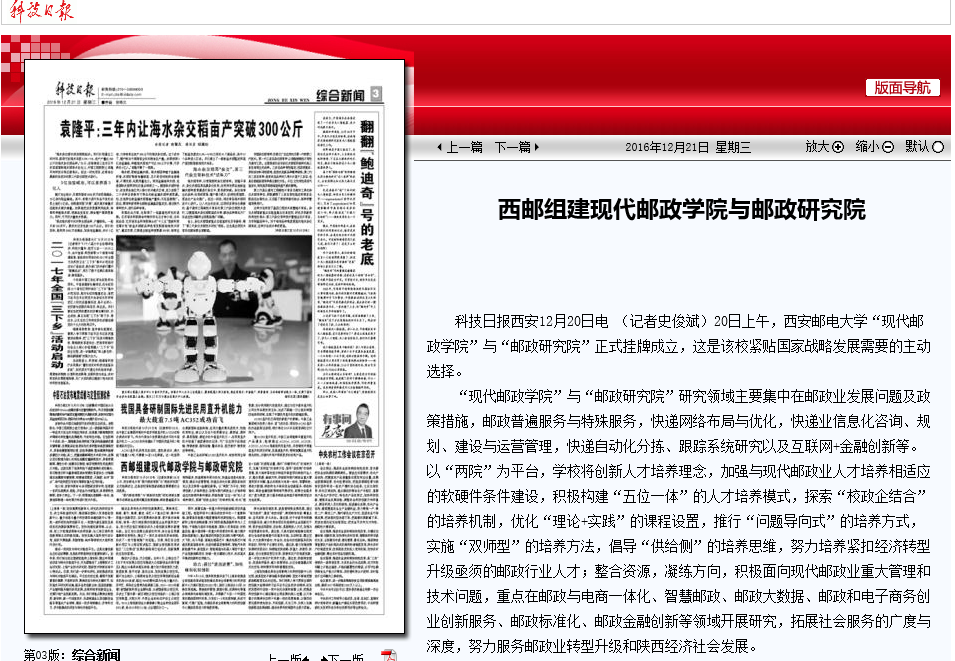 相关链接:科技日报:西邮组建现代邮政学院与邮政研究院 http://digitalpaper.stdaily.com/http_www.kjrb.com/kjrb/html/2016-12/21/content_358041.htm?div=-1