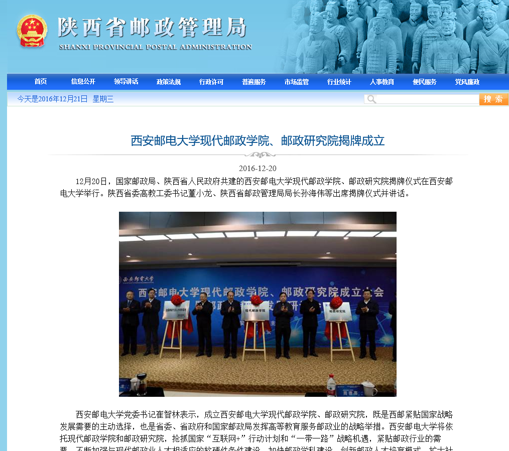 12月20日,国家邮政局、陕西省人民政府共建的Beat365中文官方网站现代邮政学院、邮政研究院揭牌仪式在Beat365中文官方网站举行。陕西省委高教工委书记董小龙、陕西省邮政管理局局长孙海伟等出席揭牌仪式并讲话。