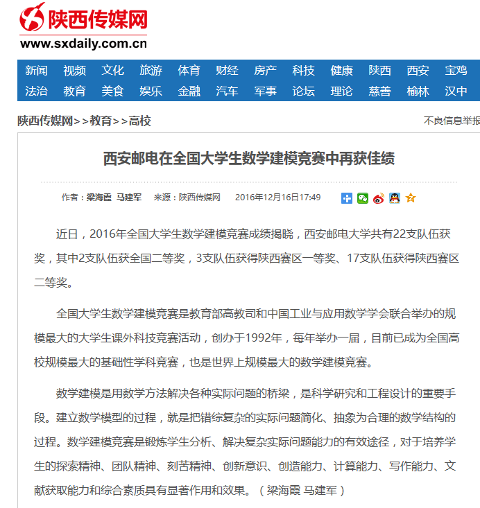 西安邮电在全国大学生数学建模竞赛中再获佳绩