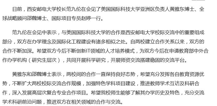 范九伦在会见中表示,与美国国际科技大学的合作是Beat365中文官方网站校际交流中的重要组成部分,双方在办学理念及国际化工程建设有诸多相似之处。自两校建立合作关系以来,双方的合作不断加深。希望双方今后不断创新IT领域的人才培养模式,为双方今后在申请教育部中外合作办学机构(研究生层次),共同开展科学研究,开展师资交流搭建稳固的交流平台。