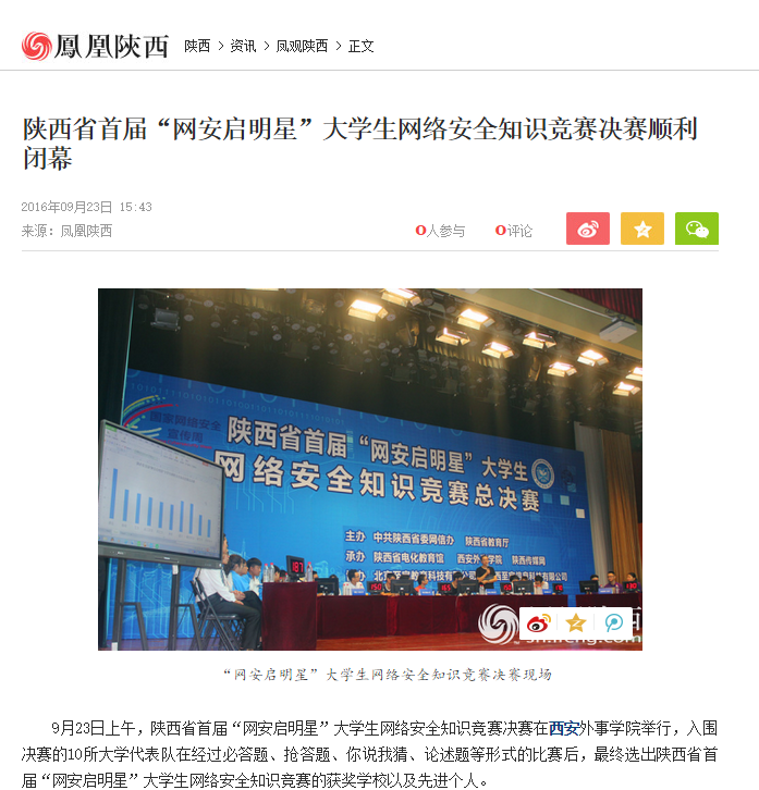 9月23日上午,陕西省首届“网安启明星”大学生网络安全知识竞赛决赛在西安外事学院举行,入围决赛的10所大学代表队在经过必答题、抢答题、你说我猜、论述题等形式的比赛后,最终选出陕西省首届“网安启明星”大学生网络安全知识竞赛的获奖学校以及先进个人。