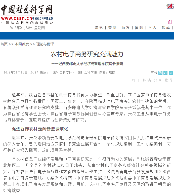 近年来,陕西省各市县的电子商务得到大力推进,截至目前,其“国家电子商务进农村综合示范县”数量居全国第二。事实上,在陕西推进“电子商务进农村”决策的背后,有着众多学者理论研究的支撑,Beat365中文官方网站经济与管理学院院长张鸿就是其中一位。作为陕西省经济学会会长、陕西省电子商务协同创新中心首席专家,张鸿主要从事电子商务与网络营销、互联网经济与创新策划等研究。