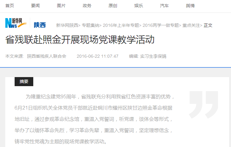为隆重纪念建党95周年,省残联充分利用我省红色资源丰富的优势,6月21日组织机关全体党员干部就近赴铜川市耀州区陕甘边照金革命根据地旧址,通过参观革命纪念馆,重温入党誓词,听党课,谈体会等形式,举办了以缅怀革命先烈,学习革命先辈,重温入党誓词,坚定理想信念,铸牢党性党魂为主题的现场党课教学活动。