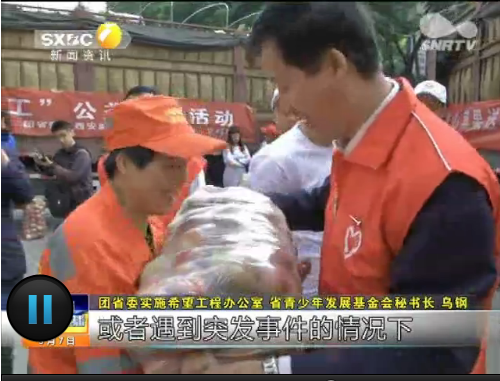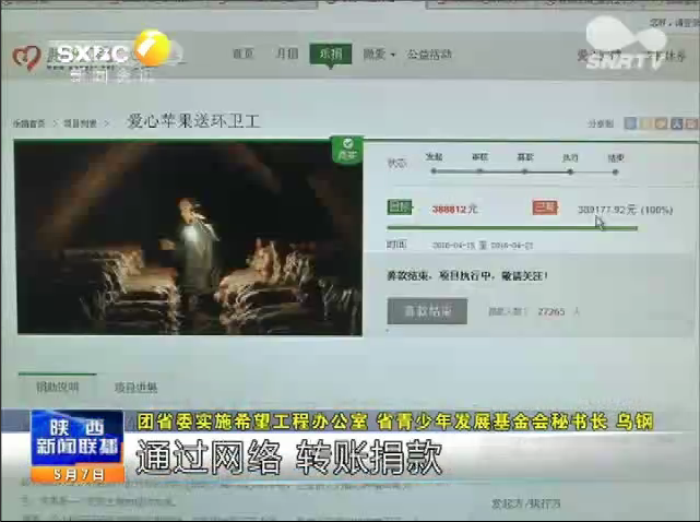2016年5月7日陕西电视台《陕西新闻联播》“互联网+公益众筹”探索公益帮扶新模式,报道Beat365中文官方网站研究生院“爱心青年帮”联合共青团陕西省委、陕西青少年发展基金会,通过腾讯公益众筹,发起“爱心苹果送环卫工”公益活动,一方面帮助魏北村等地果农解决苹果滞销问题,另一方面送城市环卫工一份特殊的节日礼物。