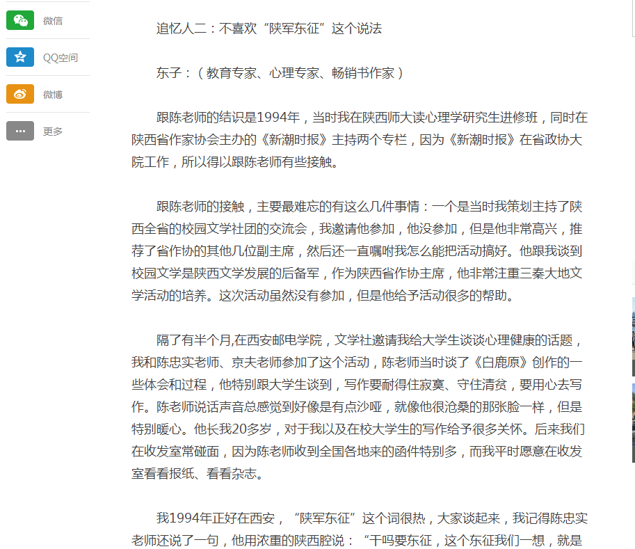 我1994年正好在西安,“陕军东征”这个词很热,大家谈起来,我记得陈忠实老师还说了一句,他用浓重的陕西腔说:“干吗要东征,这个东征我们一想,就是征战,像战争一样。”他的意思是说我们不用东征,把我们的东西写好,我们的影响就是把作品传出去,不一定非得是征还是不征。