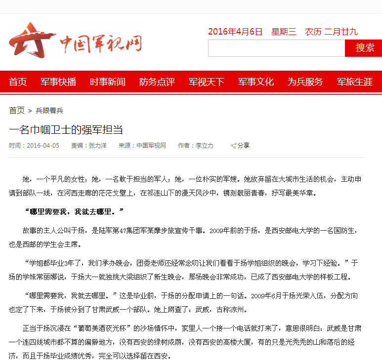 “哪里需要我,我就去哪里。”这是毕业前,于扬的分配申请上的一句话。2009年6月于扬光荣入伍,分配方向也定了下来,于扬被分到了甘肃武威一个部队。她上网查了:武威,古称凉州。