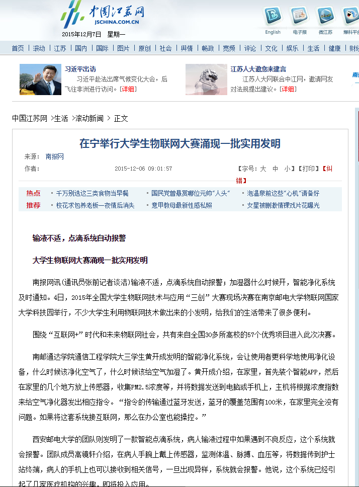 南报网讯(通讯员张前记者谈洁)输液不适,点滴系统自动报警;加湿器什么时候开,智能净化系统及时通知。4日,2015年全国大学生物联网技术与应用“三创”大赛现场决赛在南京邮电大学物联网国家大学科技园举行,不少大学生利用物联网技术做出来的小发明,给我们的生活带来了很多便利。