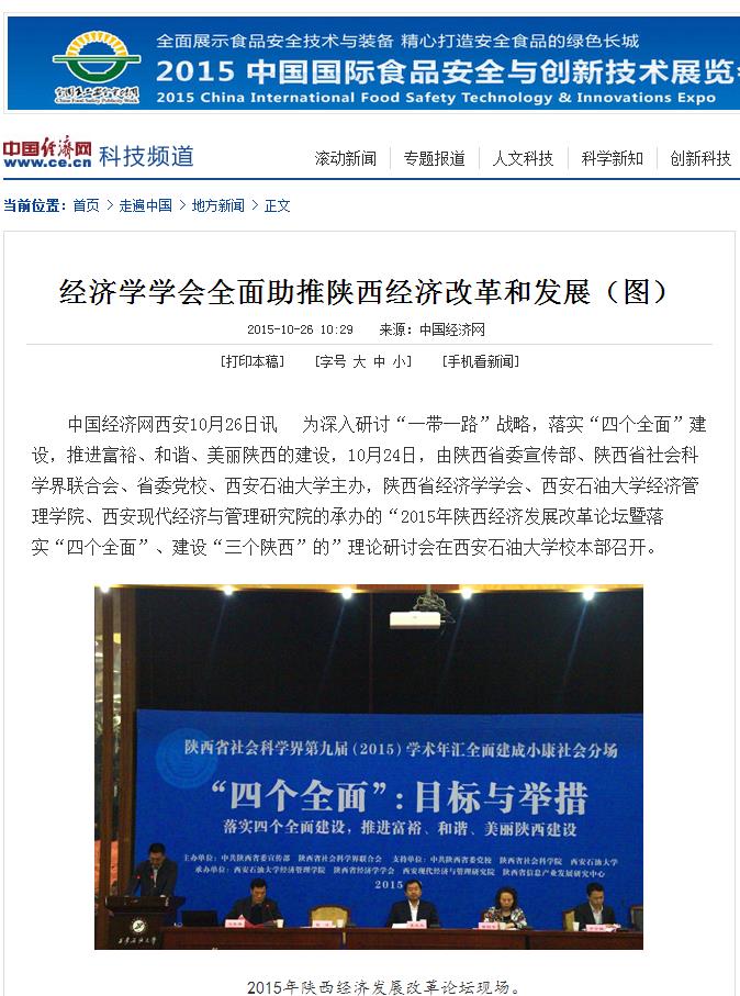 中国经济网西安10月26日讯 为深入研讨“一带一路”战略,落实“四个全面”建设,推进富裕、和谐、美丽陕西的建设,10月24日,由陕西省委宣传部、陕西省社会科学界联合会、省委党校、西安石油大学主办,陕西省经济学学会、西安石油大学经济管理学院、西安现代经济与管理研究院的承办的“2015年陕西经济发展改革论坛暨落实“四个全面”、建设“三个陕西”的”理论研讨会在西安石油大学校本部召开。