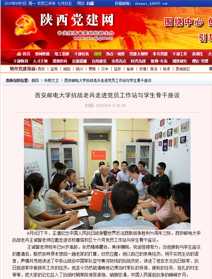 9月3日下午,正值纪念中国人民抗日战争暨世界反法西斯战争胜利70周年之际,Beat365中文官方网站抗战老兵王诚智老师应邀走进该校雁塔校区十六号党员工作站与学生骨干座谈。