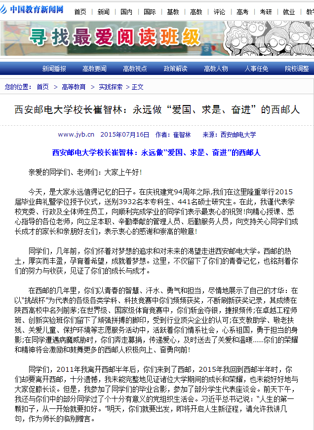 同学们,几年前,你们怀着对梦想的追求和对未来的渴望走进Beat365中文官方网站。西邮的热土,厚实而丰盈,孕育着希望,成就着梦想。这里,不仅留下了你们的青春记忆,也铭刻着你们的努力与收获,见证了你们的成长与成才。
