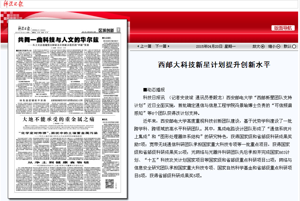 《科技日报》2015年4月20日第七版报道西邮科技新星计划提升创新水平