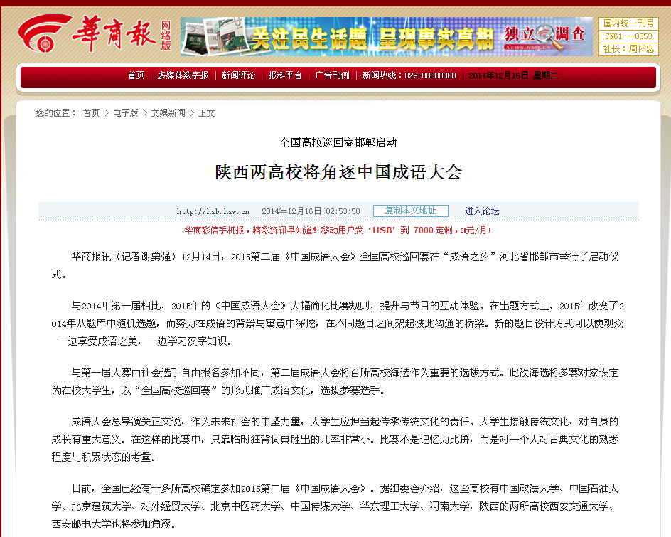 2014年12月16日,《华商报》第十二版报道陕西两高校将角逐中国成语大会。