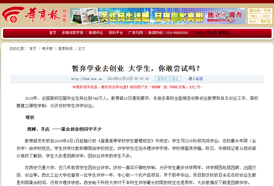 2014年12月12日,《华商报》第八版报道暂弃学业去创业 大学生你敢尝试吗?
