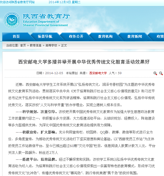 ——积极宣传,扩大影响。充分利用宣传栏、校园网、QQ群、微博、微信等形式进行全方位、多角度宣传,为推动优秀传统文化活动打下坚实思想和舆论基础。以“西邮党员工作站”为主体的党员工作站微信平台,至今已推出超过60期“文化中国”栏目,信息阅读人数累计数万人次,平台关注人数一路飙升,粉丝近2万人